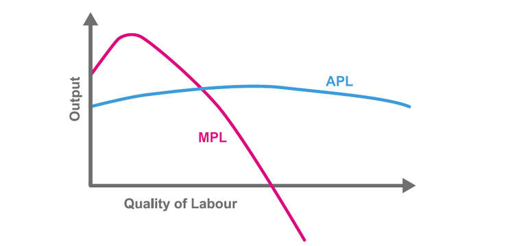 The average product of labour (APL) is the average individual output for the workforce. For 10 workers producing 100 units, the APL is 10. The APL increases at a slow rate as the organisation benefits from the advantages of additional workers. These economies of scale reach a peak and then become diseconomies of scale as average output improves. The 10 workers with an APL of 10 may operate a production line where increasing hands allow the average output to increase. When that team reaches maximum capacity for space, and workers start bumping into each other on the production line, the APL starts to reduce. Whereas APL is the average, MPL is the marginal product of labour: the change in output from adding an additional worker. Initially, there are increasing marginal returns, the benefit of adding a worker is greater than the benefit of adding the previous worker. This quickly hits a peak before descending into diminishing marginal returns where each additional worker continues to increase the overall output but made less of a difference than the last. There are two key factors in play at this point: communication and divisibility.