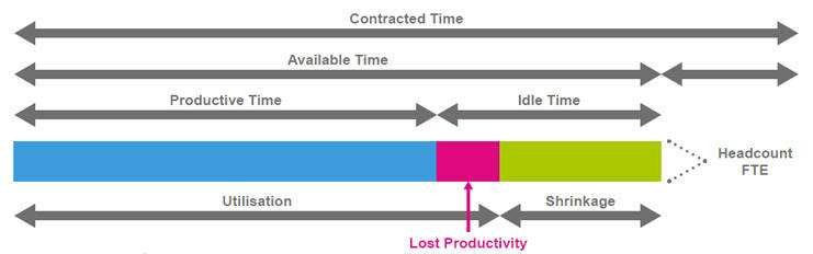 The next step in calculating the labour requirement is to add to Productive Time a Lost Productivity multiple, which comprises the speed to competence and the levels of underperformance. Speed to competence is the time it takes for a new starter to become fully productive as a result of their training; underperformance are those existing workers who are not delivering at the productive level. This creates a utilisation target.